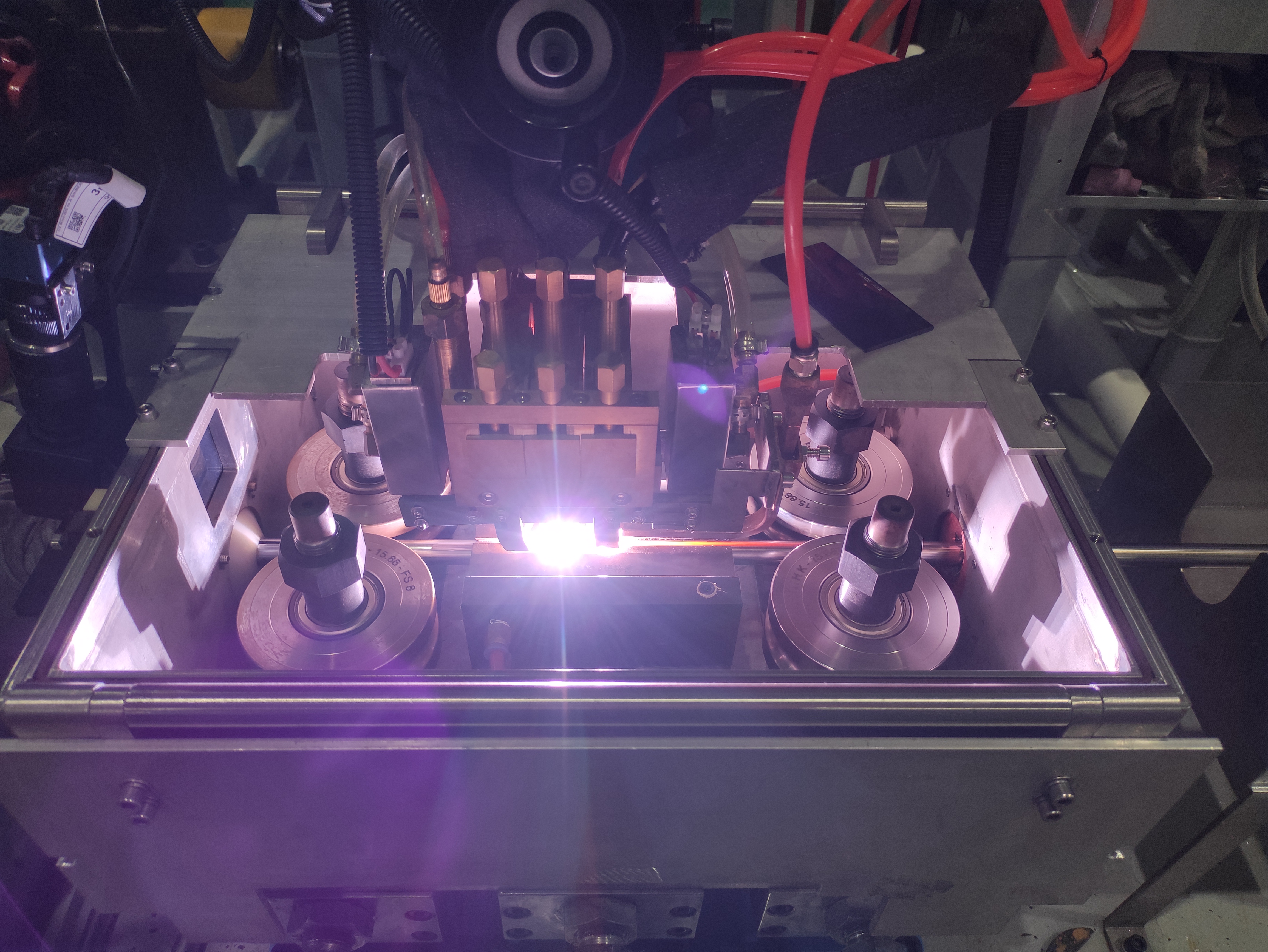 現代制管自動化生產線,國內大部分制管企業都是使用雙陰級加單電磁控,而漢高在經歷不斷測試實驗,研發出三陰級加雙電磁控氬弧焊,相較于雙陰極加單電磁控,焊接速度與焊接質量得到極大的提升,熱影響區范圍更小,管子性能更好。